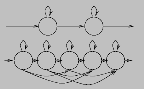 Estimation proceeds by identifying the most likely state given the current observation and the last state, and then using the observation density of that state as described above. We restrict the observation densities to be either a Gaussian or a mixture of Gaussians. There are well understood techniques for estimating the parameters of the HMM from data [16]. Figure 5 shows some representative HMM topologies.