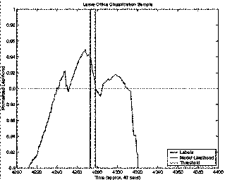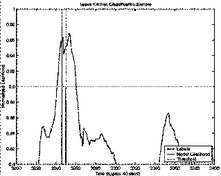 The next plots (Figure 5Figure 6, Figure 7, and Figure 8) give the actual likelihood traces for the best and worst performing event models overlaid with the ground truth labels. Although in both cases the likelihood traces are quite noisy, the peak separation near actual labels is quite good (as supported by the ROC curves). Leave Kitchen (Figure 5) had the best performance with 99.7% accuracy achieved with just a 1 state HMM trained on 4 sec. feature windows. Leave Office (Figure 7) had the worst performance with 85.8% achieved with an 8 state HMM trained on 20 sec. feature windows. Notice that the window sizes exhibit themselves in the time resolution of the classifiers (Figure 6 and Figure 8).